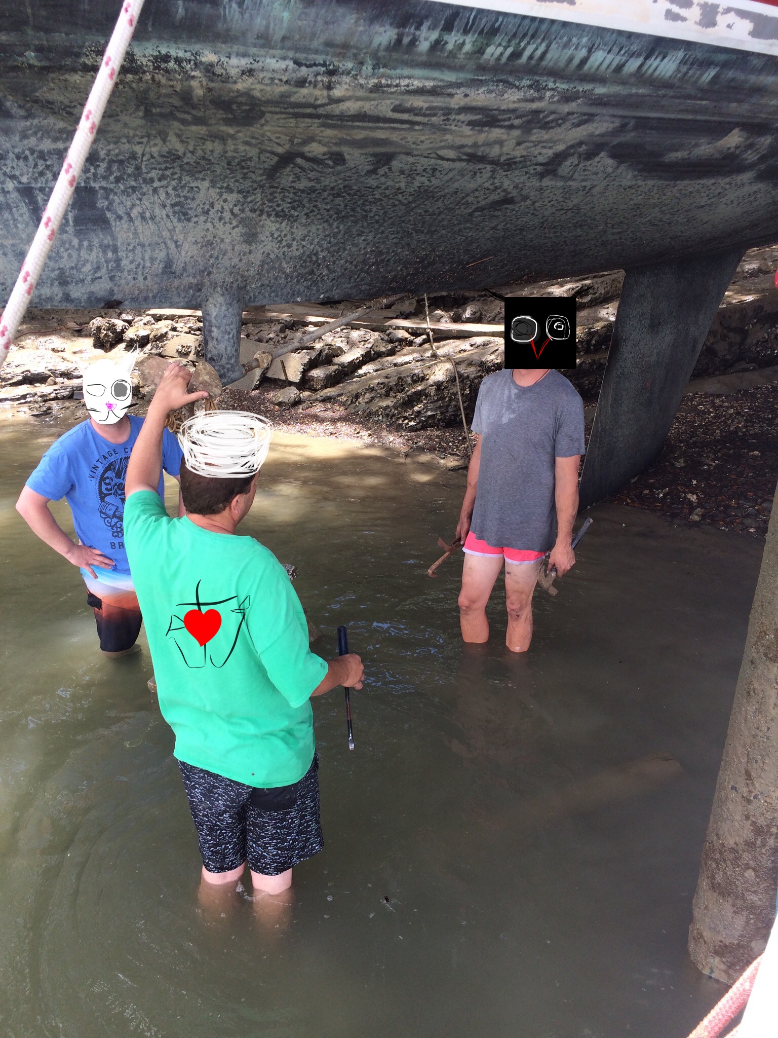 Some friends joined us today to help pull the rudder out. A lovely day out for them, lifting heavy bits of things in the heat and stomping around in the tide; a water in boots, mud on face kind of day. We need to pull the rudder out so we can turn the boat around, pull the boat ‘stern too’ up the beach (a muddy, rocky oyster bank) and paint the other side of the hull. The prop and prop shaft need to come out too for a service and a new much grander prop will be installed, eventually. There is a saying among some fix it, build it types of the animal species named ‘Brute force and ignorance’. This saying was utilised today and with a whacking of a hammer and a jiggling of the rudder it popped out-thump.