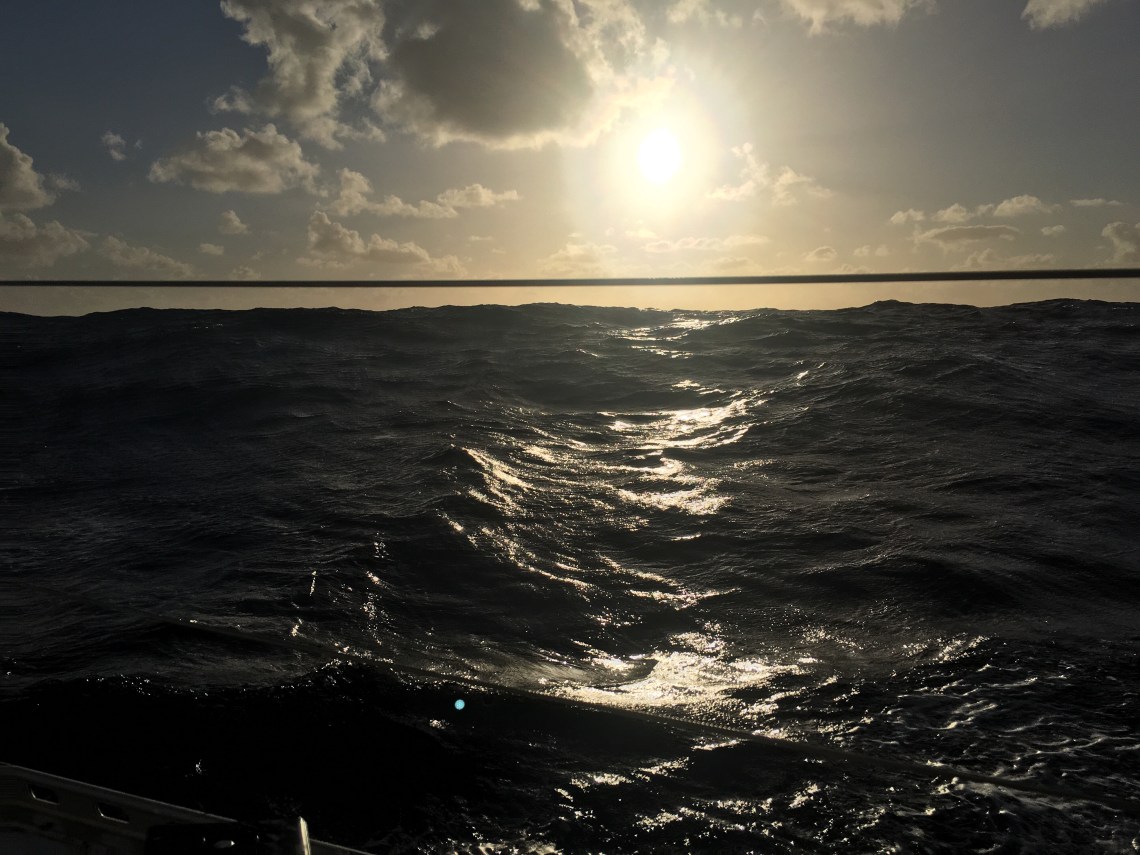 Cat “I don’t like this one bit. I grit my sharp teeth but the stars are starting to appear and with Chewbacca steering I can turn my back to the peaks. Some rise up to the first spreader, you cannot see the horizon beyond them, I turn my head away. All I do now is stare, huddled under the Bimini with blank mind, waiting for the occasional crash off a spineless wave.”