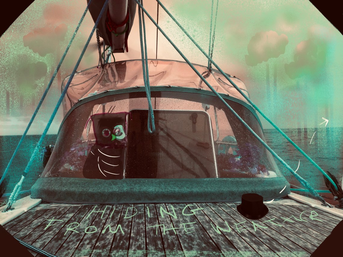 The winds at 50 knots lurch the boat to varying angles and pull hard on the anchor chain like a menaced eyed dog straining on a leach. The Cat on the outside remains calm and reads a book. They are in a safe and protected spot, but inside her brain twitches with memory of the tornado. She is not really reading the book. One dark night, a few months previously, while sitting alongside a dock, a whirling mass of energy made a tracked course the width of a two lane road through the marina and city harbour side. Darth Vader remained 200m away but was felt by occupants inside to have been picked up and pushed into the sea by a large god like hand. Other boats were not so fortunate, a few were picked up and dropped sideways on the docks then put back in the water and sunk with smashed hatches. A catamaran flew up in the air like a box kite and landed upside down, a huge super yacht laid over to 90 degrees breaking it’s mooring lines. A piece of sheet metal lifted off a building site was seen in the break of day limply hanging around a mast’s stay as if it was made of cotton. Small proofs of an unstable climate.