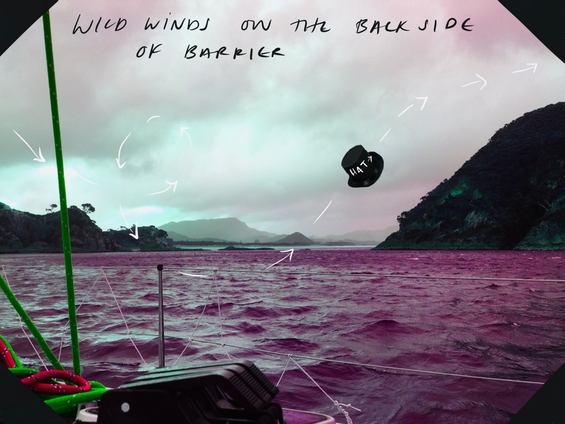 The calm followed the storm and the Owl and Cat on a Barrier blue morning made haste to sail and leave Fitzroy and the transfixing torpor like state they had found themselves in. They needed to move, make tracks, venture onwards, forwards with purpose… After a few nights in Tryphena, a destination desired for it’s scallops, sails were hoisted again and they departed for the back side. The Eastern side of the island is more exposed to large ocean swells but the weather forecast looked fine. However, the surprise came for them like a laughing jack in the box when they turned the southern corner and punched into a head wind with 3m waves. The forecast, of course, is not always right and the Cat wandered why on earth they had ever wanted to go to sea..just for a short while.