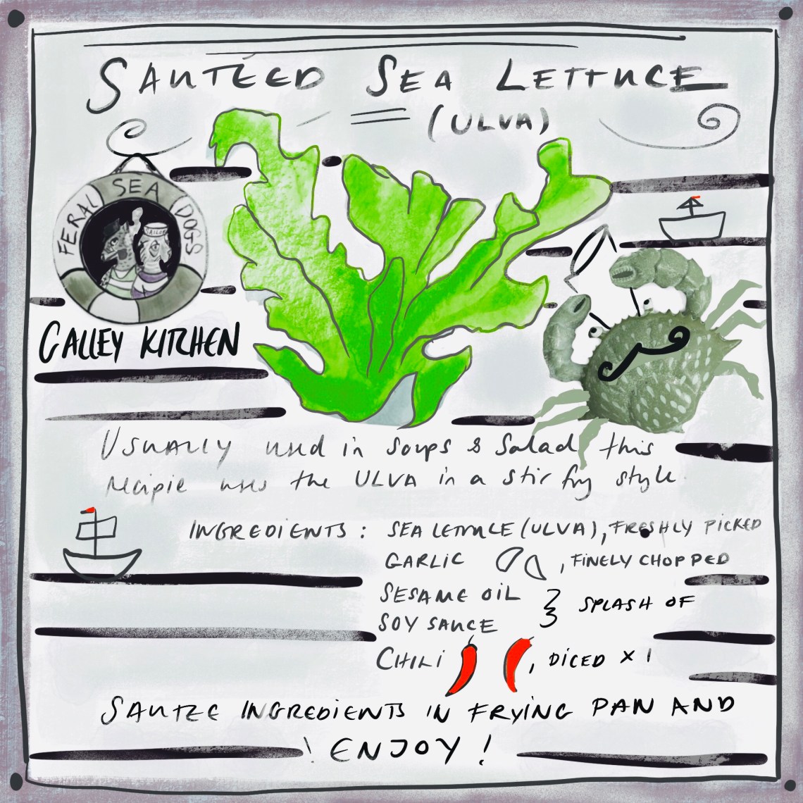 -The first bay on the back side was plentiful with seaweed which they stole off rocks and ate sautéed with a spoon (recipe below). The Owl smiled sweetly and licked his lips but his stomach was in a state of gloom.